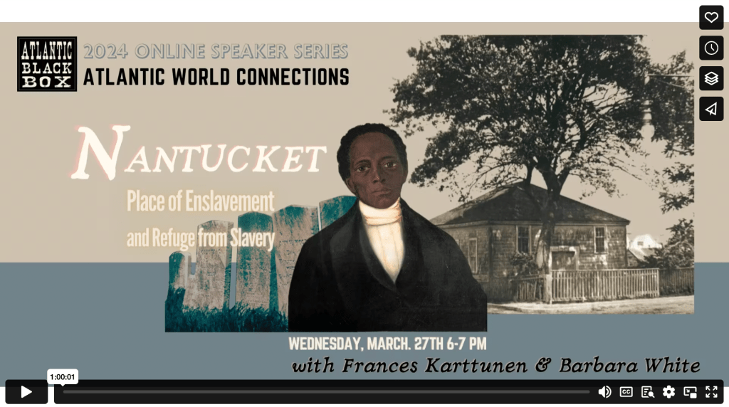 Local researchers Frances Karttunen and Barbara Ann White have long participated in efforts to surface and share the history of Nantucket’s African-heritage community. In this presentation, they will offer an account of the men, women, and children enslaved on the island between 1700 and 1775 and share the stories of those who found refuge from slavery in this settlement known for its deep Quaker roots. In the 1840s, Nantucketers battled for six years over whether Black children should be allowed to attend the island’s white schools. Our presenters will describe the multiple strategies used by the Black community to resist slavery and fight for school integration over the centuries.